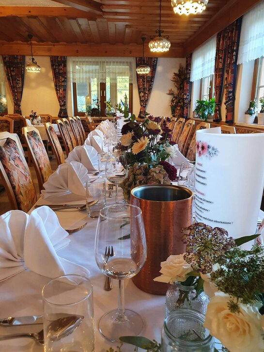 Je nach Personenanzahl stellen wir Ihnen individuell Ihre Tafel, auf Wunsch kümmern wir uns auch um Dekoration, Servietten und Speisekarten.